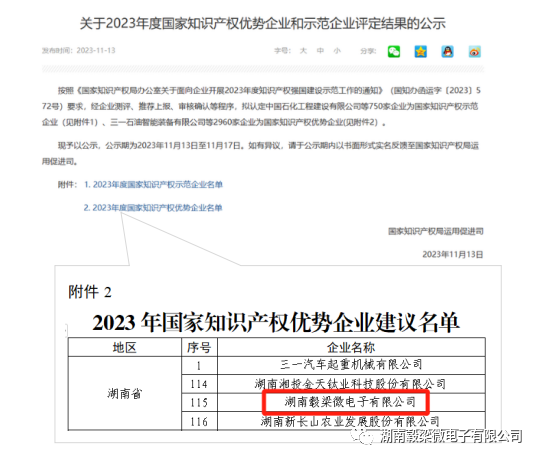近日,国家知识产权局官网发布《关于2023年度国家知识产权优势企业和示范企业评定结果的公示》,按照《国家知识产权局办公室关于面向企业开展2023年度知识产权强国建设示范工作的通知》(国知办函运字〔2023〕572号)要求,经企业测评、推荐上报、审核确认等程序严格执行,根据评定公示,湖南毂梁微电子有限公司荣登2023年度“国家知识产权优势企业”榜单。